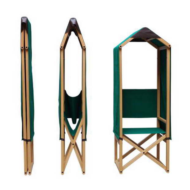 Each pitch of the roof is long enough that it can be independently rolled up and down the sides of the chair to protect the user inside from sun or wind.