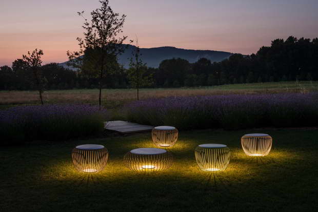 During the day, MERIDIANO hide its luminary function and acts as a stool or coffee table, bringing an original touch to gardens, patios or swimming pools. At night, this collection surprises with its LED light source proceeding from an invisible point behind the top. Its structure of circular corrugated steel rods projects pleasant light and shadow effects to its surroundings, illuminating and dressing the space.