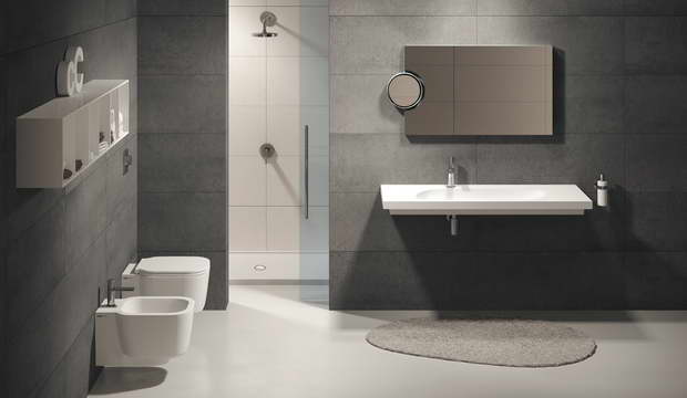 Cubika includes a suspended toilet and bidet, with clean lines a double volume, and two washbasins, 120 cm or 140 cm, designed to be installed suspended or semi-recessed, featuring an elegantly organic form and a large basin.