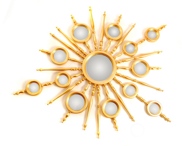 The exterior frame is composed of numerous sticks that lead to additional mirrors. A slim internal frame coated in purely soft GOLD leaf surrounds the interior of the mirrors. The frame is made from solid oak wood or mahogany and is available in two finishes (silver or gold leaf).