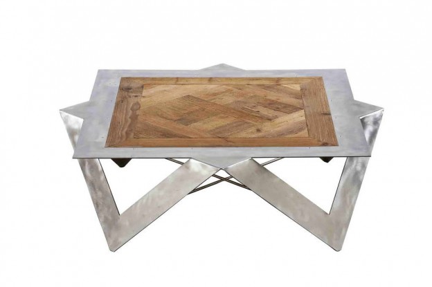 DB004472 – Coffee table with natural wooden base and welded metal top. The tangible support of the old pine gives concreteness and substance to the smooth, ethereal and mirrored metal.