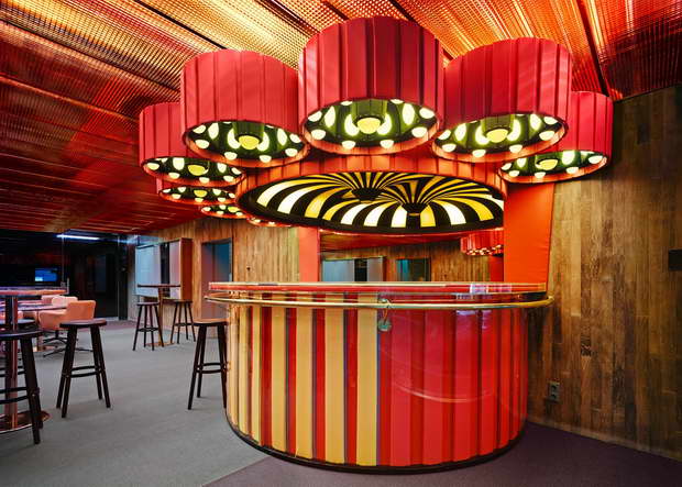 Nandoo, a superior carpet weave, has been brought to bear on both floors. The basement floor accommodates  the stage and rows of seating for the audience. The carpeting laid here displays hues in a striking violet and contrasting light green. On the ground floor with bar, the carpet with a two-tone nuance corresponds with the eclectic installation comprised of a bar staged in red and domed ceiling in black & white stripes.
