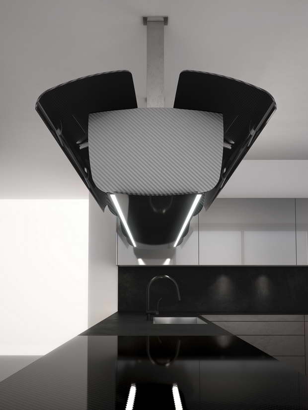 INVISIBILE, the new elegantly designed kitchen, presents furthermore a new varnishing system made from liquid metal which gives to the wall cabinets an aesthetic that is absolutely perfect for the materiality of the carbon fiber. The total absence of grooves and handles, thanks to the use of an opening system unique toToncelli, highlights again the rigor and the clean line giving a result that is quite invisible.