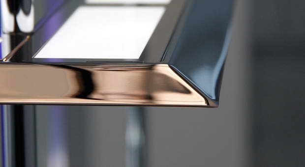 24 chrome aluminum frames, each containing four Lumiblade CN4 OLED modules, are stacked above each other and surround a diagonal glass centerpiece with a two-tone finish. Various colors and reflections appear, depending on the viewer’s perspective. During the day the glass surface turns blue, purple and transparent, while at night it becomes a shimmering gold mirror flooded in the attractive light of 384 OLEDs.