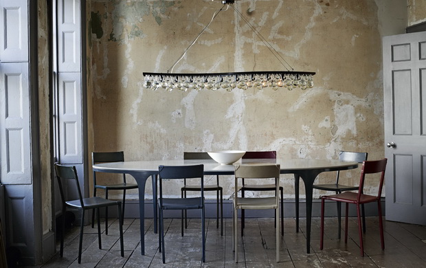 The elegant new willow dining table is an oval interpretation of the whippet. With granite grey steel legs and polished plaster top this graceful table looks beautiful with sable dining chairs in hand dyed leather and the arctic pear single wave chandelier.